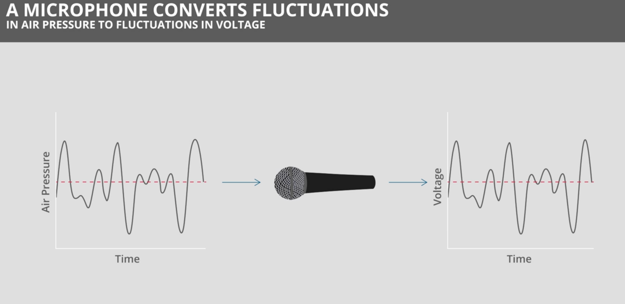 마이크를 생각해보자. 마이크는 위와 같이 계속 움직이는 기압을 계속 움직이는 전압으로 바꾸는 것이다. (아날로그 신호->디지털화)