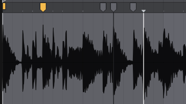 오디오 샘플을 에이블톤에 로드하고, 더블 클릭해서 Clip View로 들어가면 오디오 파형 위에 이렇게 마우스를 갖다 대면 북마크처럼 생긴 모양이 떠있다. (회색, 노란색) 에이블톤이 자동으로 오디오파일을 읽고, Transient별로 구분해주는 것이다.