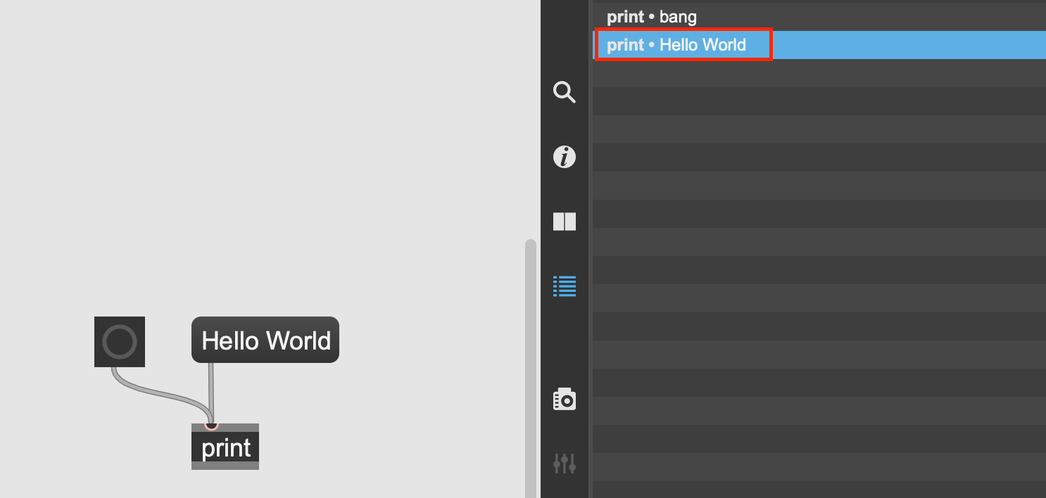 Hello World 메시지 박스를 누르면 그림과 같이 Max console에 그대로 'Hello World'가 프린트 된다.