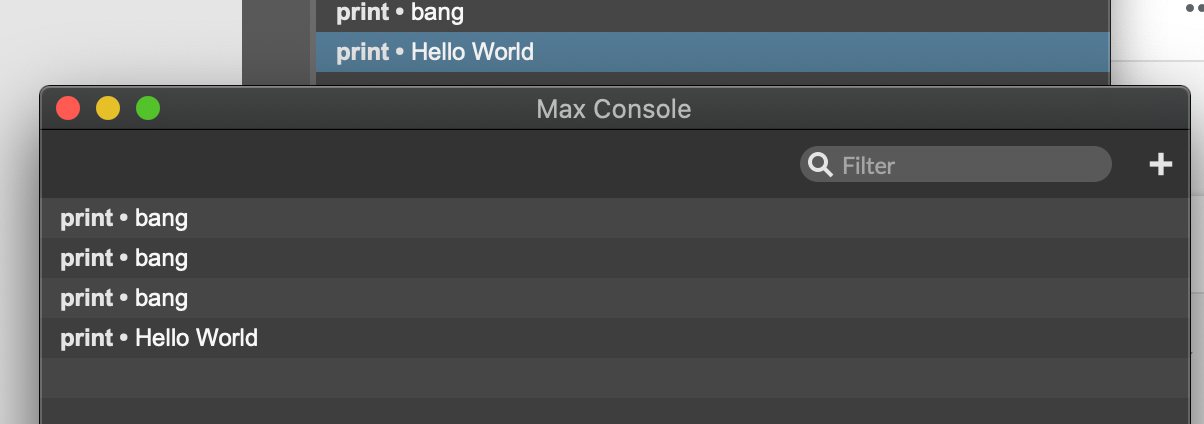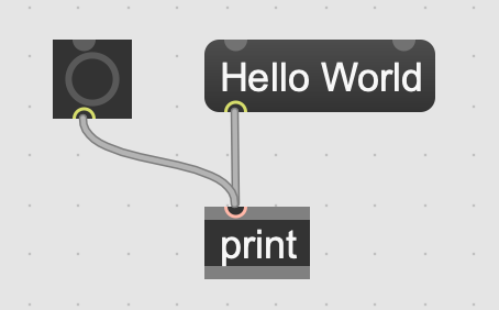 Hello World 메시지 박스를 누르면 그림과 같이 Max console에 그대로 'Hello World'가 프린트 된다.