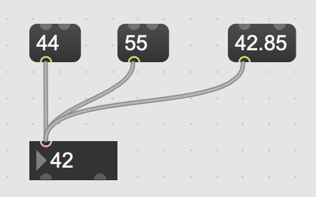그림과 같이 Message 박스 3개를 각기 다른 숫자로 하여 만들어보자. 그리고 Number 박스의 inlet에 모두 연결해준다.