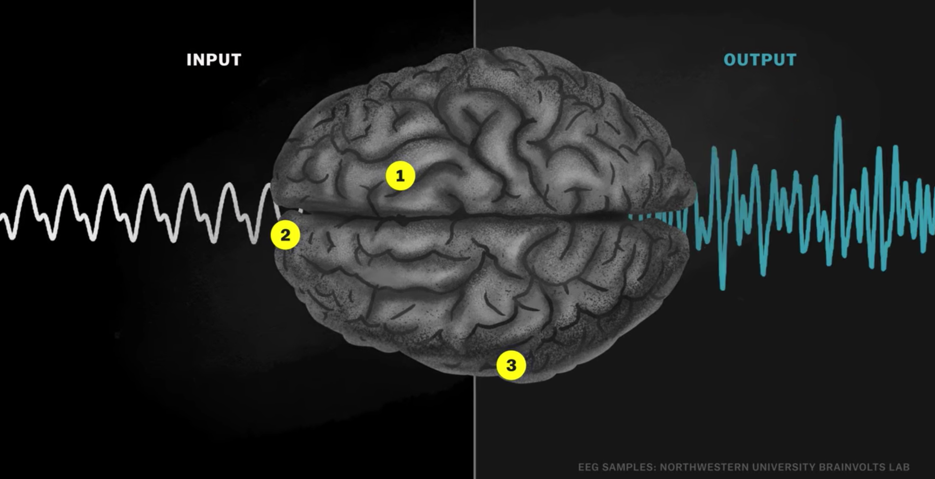 머리 이 세 부분에 전극을 놓고 반복되는 소리를 들려주게 되면, 전극에서 나오는 신호는 좀 더 지저분하고 둔한 소리로 뇌가 인식하게 됩니다.