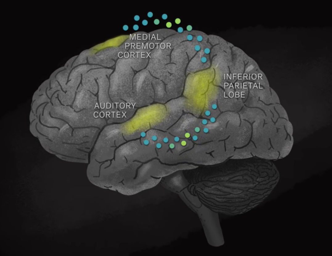 이렇게 BPM 즉, 박자를 느끼기 위해서는 전운동피질 (Medial Premotor Cortex), 열성 두정엽 (Inferior Parietal Lobe), 청각피질(Auditory Cortex)라는 뇌의 여러 부분이 긴밀하게 연결되어야 하는데요, 일반적인 동물들에게서 이러한 요소들이 긴밀하게 연결되는 경우는 아주 드뭅니다.