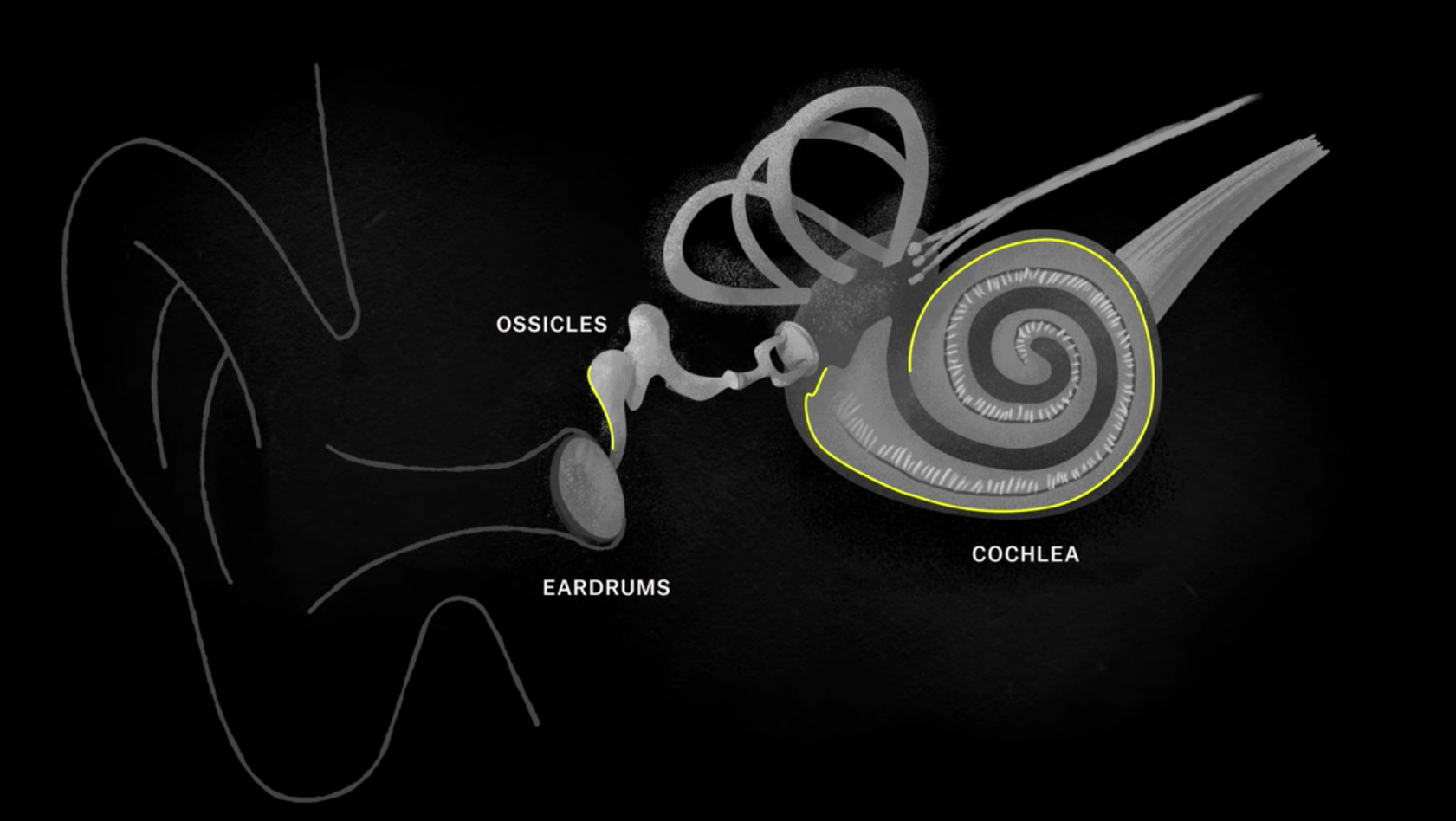우선 우리가 음악을 음악이라고 인지하여 듣게되는 단계 이전에 음악은 그저 공기에 지나지 않습니다. 소리는 공기의 진동으로 시작하고, 그 진동이 우리의 고막을 진동시키고, 작은 뼈가 그 진동을 달팽이관의 액체에 전달합니다. 그리고 그 진동이 털의 세포를 진동시켜 우리는 소리를 듣게 됩니다.