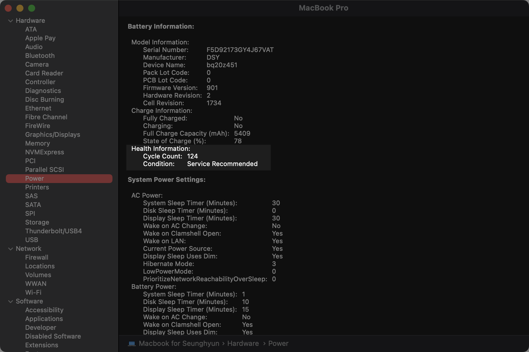 이제 사이드바에서 Power를 클릭하면, 배터리의 건강 상태 정보를 확인할 수 있다. 내 맥북은 사이클 횟수가 1000회에 한참 못미치는데도 배터리 상태가 ':서비스 요망' 이다. 이는 내가 항상 맥북에 파워 어뎁터를 껴놓고 작업하기 때문이다.