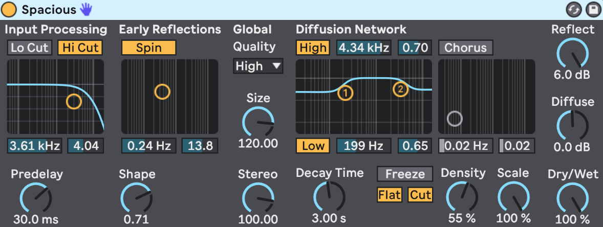 위와 같은 상태에서 Spacious Reverb Chain 전에 Redux 이펙트를 추가해줌으로써 이 겹쳐진 소리를 더 어둡게 만들어보자.