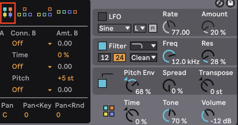 필터를 켜주고, 필터 타입은 low pass, Freq는 18.5로 끝까지 돌려주시고, Res는 62%에 맞춰줍니다.