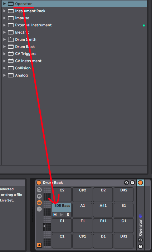 Instrument->Drum Rack을 로드하고, Operator를 패드 중 한 곳에 삽입해 줍니다. 이번에는 808 Bass 드럼 신스 사운드를 만들 것이기 때문에, Cmd R (Ctrl R)를 눌러 Operator->808 Bass로 이름을 수정해줍니다.