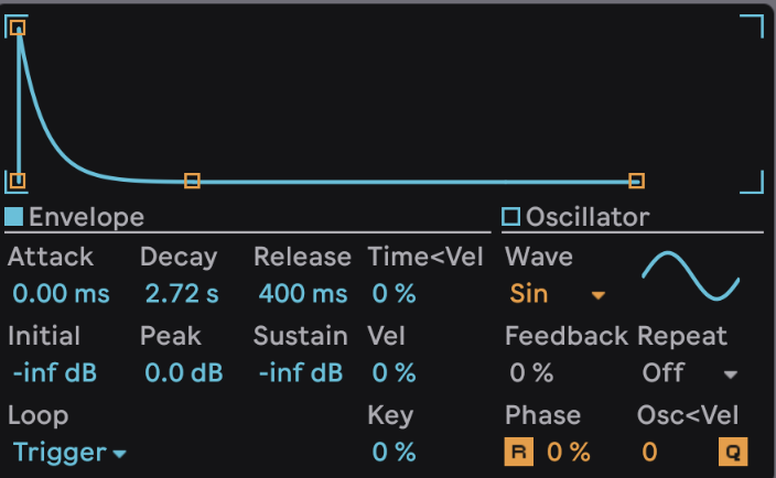 Operator를 로드하고, 음을 입력해보자. 순수한 사인파 소리가 납니다. 파형이 사인파로 자동 선택이 되어있습니다.