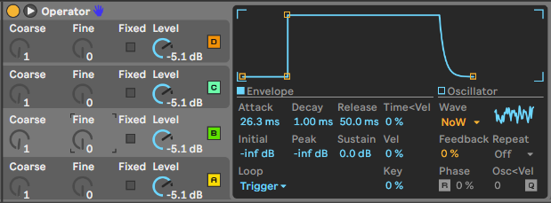 Operator는 여러 합성기법들을 결합시켜 만든 에이블톤사의 진보적이면서 두루두루 사용되는 유연한 신디사이저입니다.